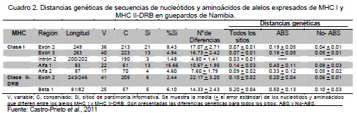 En estudios recientes del MHC, Castro-Prieto et al. (2011) utilizaron métodos moleculares de alta resolución (Polimorfismos de Conformación de Cadena Simple [SSCP], análisis, clonación y secuenciación) en 149 guepardos de Namibia para identificar la diversidad genética en los loci MHC I y MHC II-DRB. Adicionalmente, validaron la expresión de los alelos observados, investigaron la relación filogenética de los alelos del MHC para asignarlos a determinados loci, e hicieron pruebas de selección positiva (Cuadro 2).